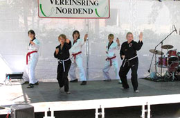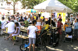 Frankfurt-Nordend, 15.07.2006. Es gab Live Musik, Spanferkel, Glücksrad, Schachspielen, Holzschnitzen, Bücher und Kalligraphie. Allerdings stand im Zentrum des Glauburgfestes am 15. Juli der asiatische Kampfsport. Zum ersten Mal wurden vier Kampfsportarten auf dem Sommerfest im Nordend an einem Tag präsentiert, darunter drei aus Asien: Tae Kwon Do (Frauen in Bewegung e.V.), Hapkido (Hapkido Zentrum Frankfurt) und Kungfu und Taichi (Tai Chi Dao Kungfu Schule) sorgten gemeinsam mit Capoeira, (Jugendhaus Heideplatz) für die Highlights im Unterhaltungsprogramm.