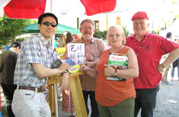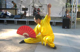 Für Herrn Damin Ren, Geschäftsführer beim China Kultur- und Wirtschafts-Service (CKWS) in Frankfurt, war es eine besondere Freude, die chinesische Gruppe zu organisieren. Dank der Koordinierung von Herrn Franz Schmitt aus der Wirtschaftsförderung Frankfurt war der Kontakt zum Glauburgfest hergestellt worden. Herr Ren versuchte mit den besten Akteuren in Frankfurt die kulturelle Vielfalt Chinas zu zeigen. Herr Tai Zheng, chinesischer Kalligraph und Künstler für Malerei, schrieb für die Besucher ihren Namen auf chinesisch mit Pinsel und übersetzt die Zeichen in poetischen Sätzen auf deutsch. Der Leiter der Tai Chi Dao Kungfu Schule, Herrn Aihui Li, der im Jahr 1996 den Nationalmeistertitel Chinas erhielt, zeigte mit 15 Schülern aus Frankfurt und dessen Umgebung Shaolin-Kungfu und traditionelle Tai-Chi-Übungen. Das Shaolin-Kungfu betont die Kraft und die Schnelligkeit, während sich das Tai Chi mit körperlicher und geistiger Harmonie beschäftigt. Auch die Bücher über das Kungfu und Taichi, chinesische Malerei, Kochrezepte, chinesische Medizin, chinesische Philosophie aus dem ChinaCard-Buchladen an der Bockenheimer Warte haben wie ein frischer Wind zahlreiche Besucher angezogen. Herr Zheng, Herr Li und der ChinaCard-Buchladen sind alle Partner der ChinaCard, durch die die besten Chinarelevanten Angebote und Geschäfte gebündelt werden und mit der man bei den beteiligten Geschäftspartnern Sonderkonditionen erhalten kann. Mitarbeiter des CKWS verteilten Reiseprospekte und Reiseführer über China, die Olympiade in Beijing 2008 und die Drei Schluchten vom chinesischen Fremdenver-kehrsamt.